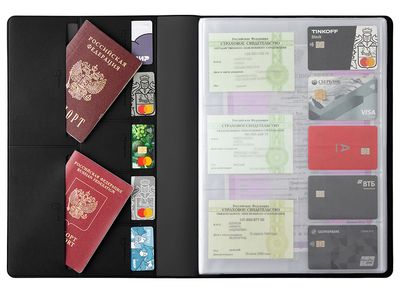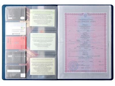 Органайзер формата А4 позволяет хранить документы в расправленном виде, защищая их от механических повреждений. С ним свидетельства о рождении, браке и др. важные документы будут рассортированы и доступны для просмотра, будучи помещенными в прозрачные кармашки из пленки ПВХ. Конструкция внутри - это обложки шести форматов: - 8,5 х 6 см (10 шт) - 10 х 10,5 см (6 шт) - 15,3 х 10 см (8 шт) - 22 х 31 см (8 шт) - 22 х 15,5 см (4 шт) - 19 х 26,5 см (2 шт) Сама обложка выполнена из экокожи и разбита на: - два больших кармана-отделения А4 21 х 32 см - 6 горизонтальных кармана 10 х 14 см с подписями и иконками, уточняющими тип документа, который можно поместить внутрь - 5 карманов 6,5 х 5,5 см под визитки или кредитные карты.