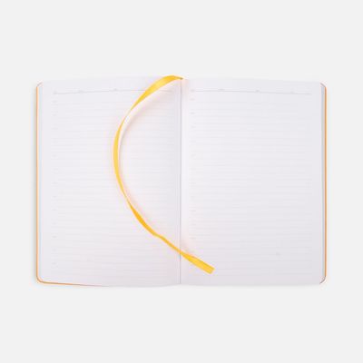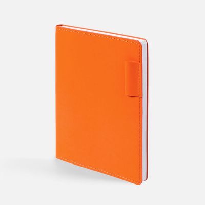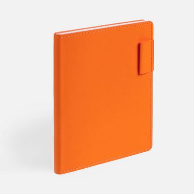 Ежедневник с гибкой обложкой из материала Soft Touch, оранжевый ОО и Latte, оранжевый ОО (внутренний материал), дополнен петелькой для ручки из покровного материала, капталом, ляссе и закрашенным срезом обложки в цвет материала.