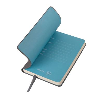 Блокнот с мягкой термоактивной обложкой и популярной комбинацией цветов Термоактивный PU материал Velvet Цвет обложки, близкий к Pantone 3435С Цвет форзаца, близкий к Pantone Cool Gray 5U Внутренний блок 192 страницы в клетку Идеально скругленные углы блока Перфорированные 8 последних листов Кремовая FSC бумага 70 г м2 Ляссе в тон обложки Фирменный сливбокс thINKme