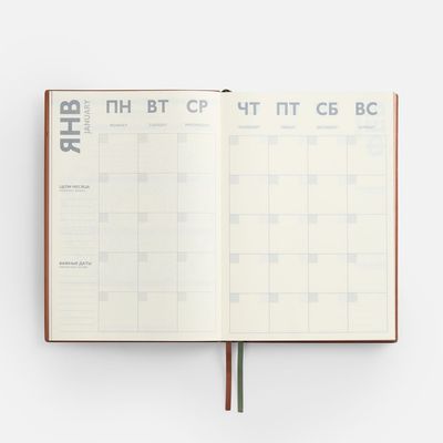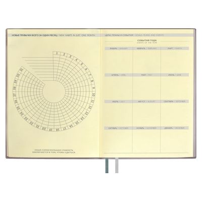 Ежедневник с гибкой обложкой и закладкой из искусственной кожи, дополнен капталом и двойным ляссе.