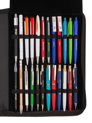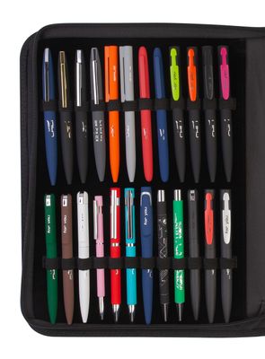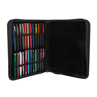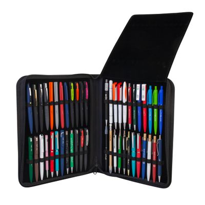Презентационный кейс на 48 ручек и карандашей с разнообразными видами нанесения, включая зеркальную гравировку, гравировку по металлу и бамбуку, тампопечать, 3D-УФпечать.
