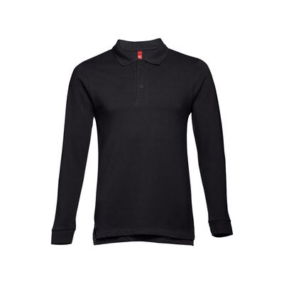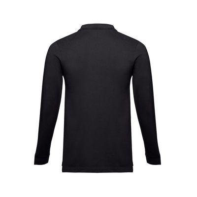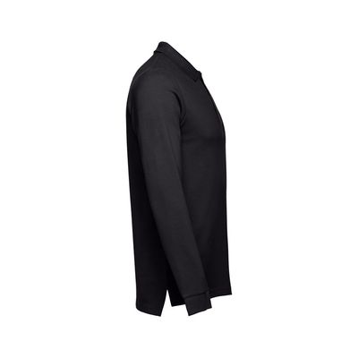 Мужская рубашка-поло с длинным рукавом из хлопковой ткани-пике.  Полотно футболки упругое и гладкое  благодаря обработке ферментами "enzyme wash" и  сохраняет форму при стирке.  Модель полуприлегающего силуэта. Благодаря манжете из риба 1х1 рукав смотрится очень аккуратно. Воротник также выполнен из риба 1х1, внутри ворота - укрепляющая тесьма по горловине. Планка с 3 пуговицами в цвет основной ткани изделия. Запасная пуговица на ярлыке во внутреннем боковом шве.