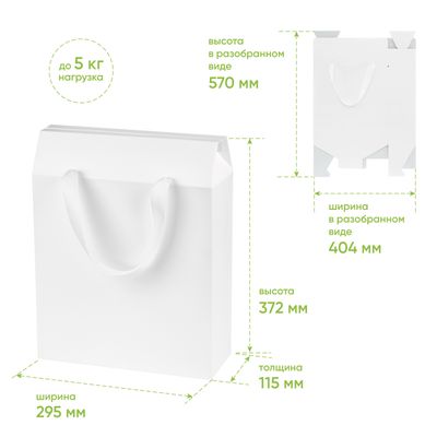 Универсальный пакет – коробка выполнен в белом цвете с ручками из рапсовой ленты. Вместительный и изящный, он станет хорошим решением упаковки подарка.