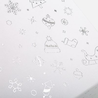 Коробка выполнена из переплетного картона толщиной 1,5 мм, кашированного бумагой с тиснением серебристой фольгой.