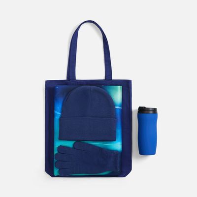 Набор «Северное сиятельство» — это выражение заботы и нетривиальный комплимент в одном шопере! В нем тонко переплетены дух современного города и очарование северной сказки. Его элементы лаконичны и функциональны, а главная изюминка — живописный плед с изображением aurora borealis — добавляет ноту настоящего чуда.