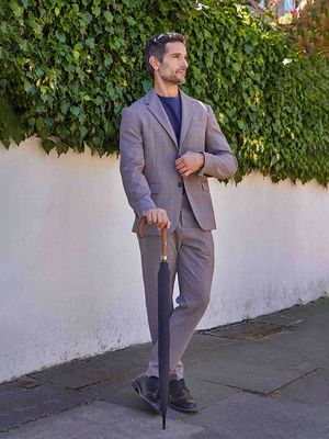 Большой фактурный купол сделан из люксового поликоттона, который очень красиво и необычно смотрится на свету. Деревянная рукоятка с металлическим кольцом, под которое заправляются спицы, добавляет аксессуару престижа и изящества.