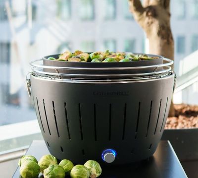 Угольный гриль округлой формы. Благодаря особой конструкции нижняя часть гриля не нагревается, его можно размещать даже на чувствительных поверхностях.