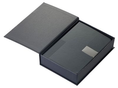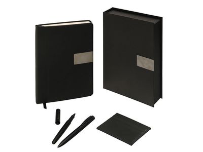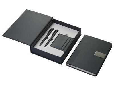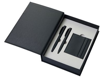 "Goethe" - это премиальный подарочный набор в коробке, закрывающейся на магнит. Комплект включает две ручки — шариковую и роллер — с высококачественными синими немецкими чернилами Dokumental и пишущими узлами Premec (в шариковой). Их дополняет картхолдер из экокожи на 4 карты с отделением для наличности. Завершает этот комплект блокнот в твердой обложке из искусственной кожи. Внутри него 96 листов кремовой бумаги с FSC-сертификатом плотностью 80 г/м2.