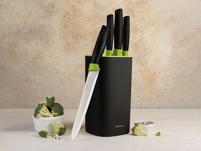 Набор ножей 5 предметов NADOBA серии Olivia состоит из: нож овощной, 9 см, нож универсальный, 12,5 см, нож разделочный, 20 см, нож поварской, 20 см и универсального блока для хранения ножей.