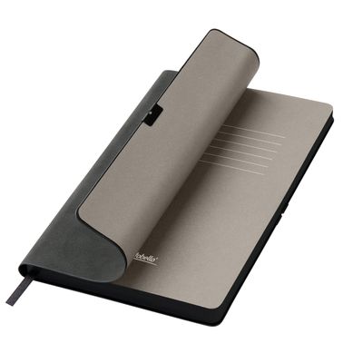 Горизонтальная резинка, фиксирующая обложку, дополнена металлическими элементами, которые не только защищают обложку от повреждений, но и служат стильным акцентом. Матовый срез в тон обложки и светло-кремовые страницы из гладкого, слегка шелковистого офсета подчеркивают изысканность дизайна. Атласное ляссе гармонично завершает образ этого элегантного ежедневника.